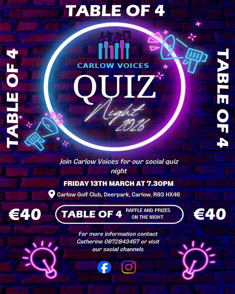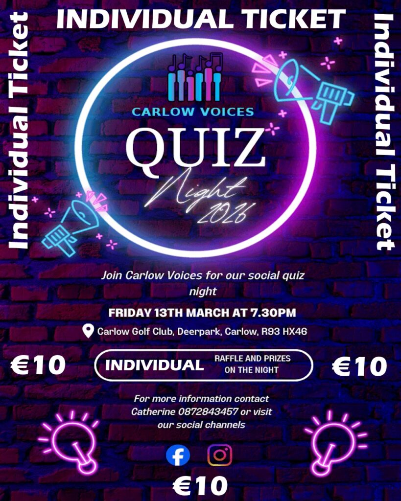 Quiz night held at  Carlow Golf Club starting at 7:30pm, this option is for individuals to take part.